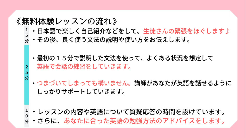 無料体験レッスン希望日時を第三希望日までご記入をお願いいたします。 (無料体験レッスンの所要時間は1時間程度です) 記入例: 1/31(水) 14:00~